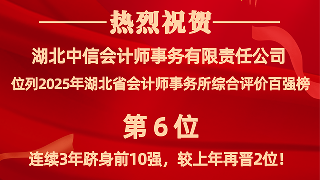 2018-2025連續(xù)8年在湖北省會(huì)計(jì)師事務(wù)所百?gòu)?qiáng)綜合排名中名列前茅(前14強(qiáng)),連續(xù)3年躋身前10強(qiáng)。2025年位列湖北省行業(yè)百?gòu)?qiáng)綜合排名第6位。