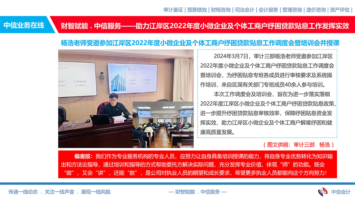 03/152024楊浩老師收邀參加江岸區(qū)2022年小微企業(yè)及個體工商戶紓困貸款貼息工作調(diào)度會暨培訓(xùn)會并授課