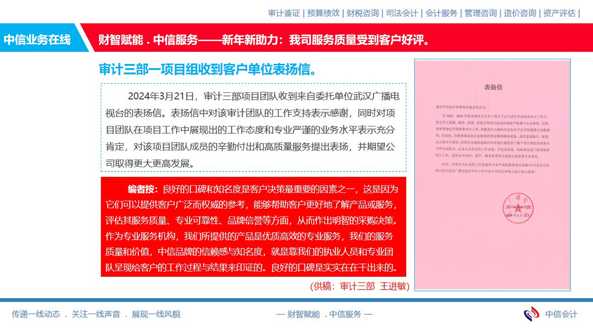——我司一年報審計項目服務(wù)質(zhì)量受到客戶好評 -