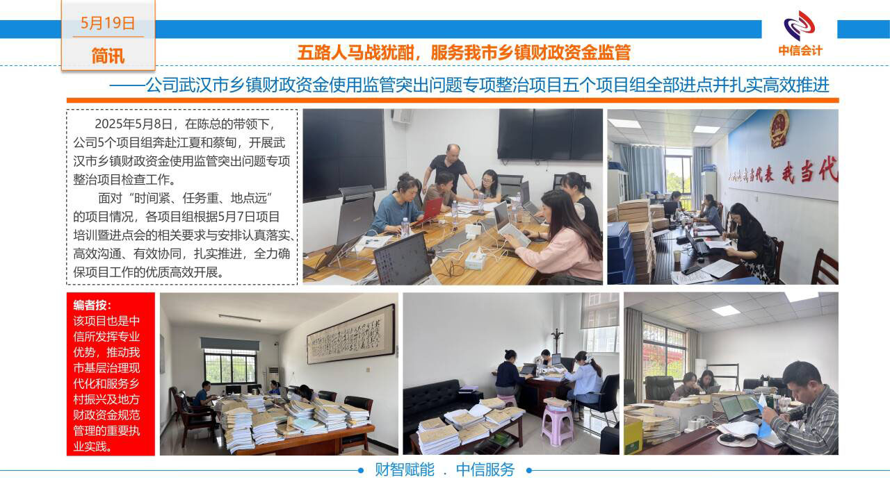 ——公司武漢市鄉(xiāng)鎮(zhèn)財政資金使用監(jiān)管突出問題專項整治項目五個項目組全部進點并扎實高效推進 -