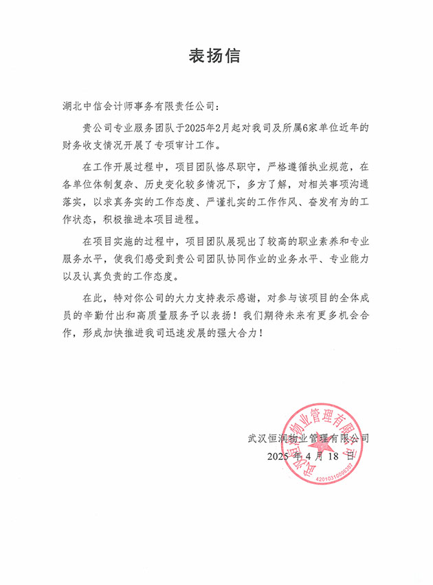 武漢恒潤(rùn)物業(yè)管理有限公司表揚(yáng)信