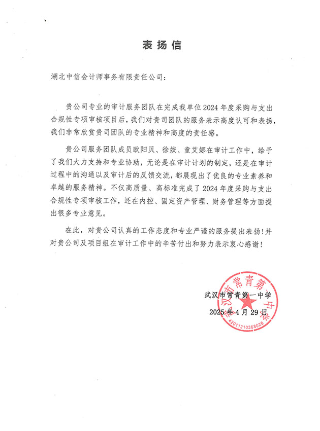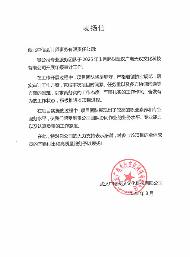 武漢廣電天漢文化科技有限公司表揚(yáng)信