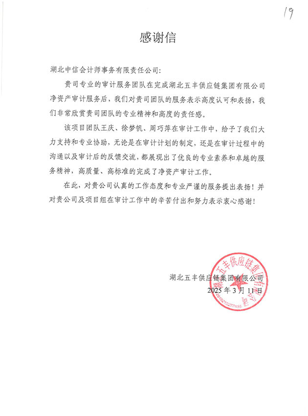 湖北五豐供應(yīng)鏈集團(tuán)有限公司感謝信