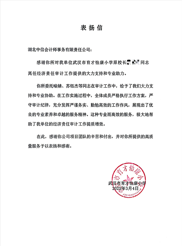 武漢市育才怡康小學(xué)表揚(yáng)信
