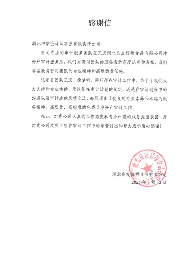 湖北農(nóng)發(fā)飼料有限公司感謝信