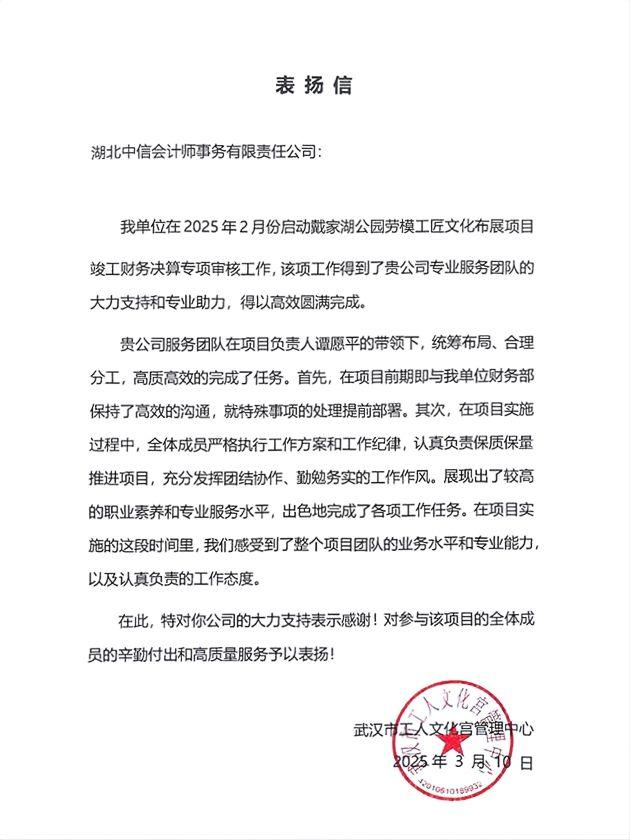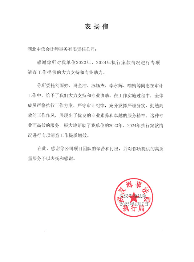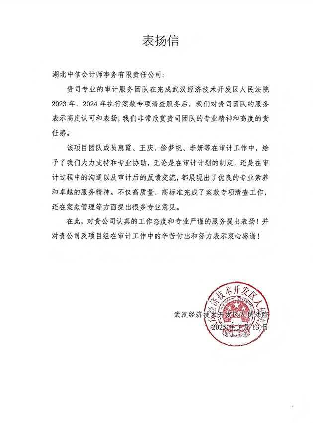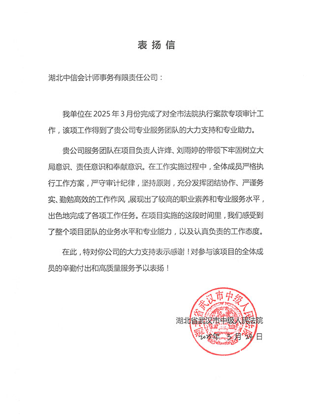 湖北省武漢市中級(jí)人民法院表揚(yáng)信