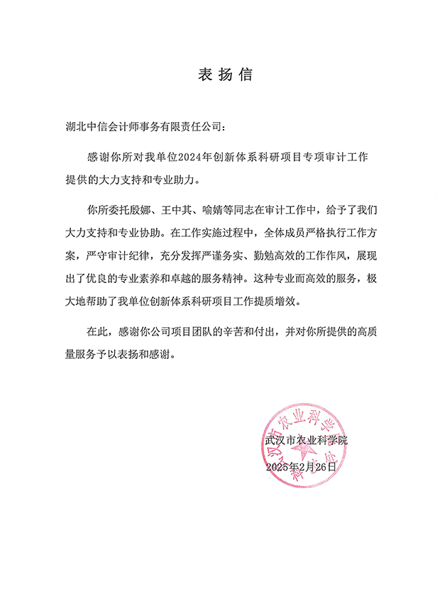 武漢市農(nóng)業(yè)科學(xué)院表揚(yáng)信