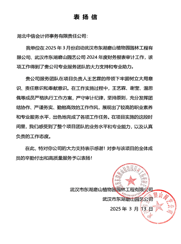 東湖磨山植物園園林工程有限公司表揚(yáng)信