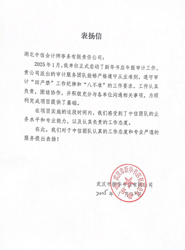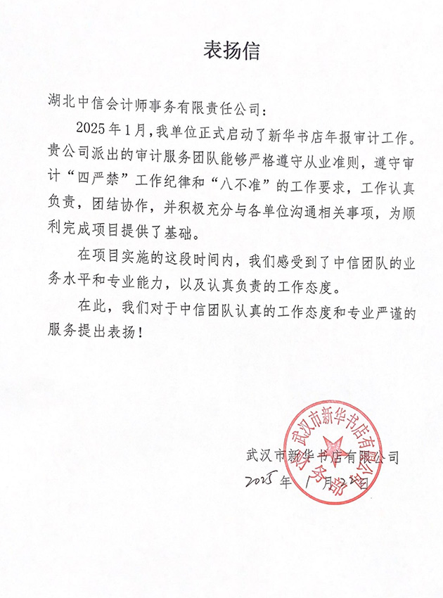 武漢市新華書店有限公司表揚(yáng)信