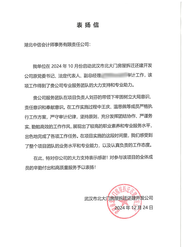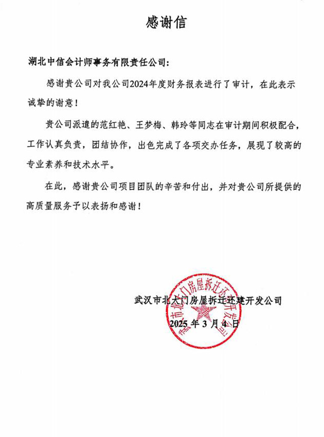 武漢市北大門房屋拆遷還建開發(fā)公司感謝信