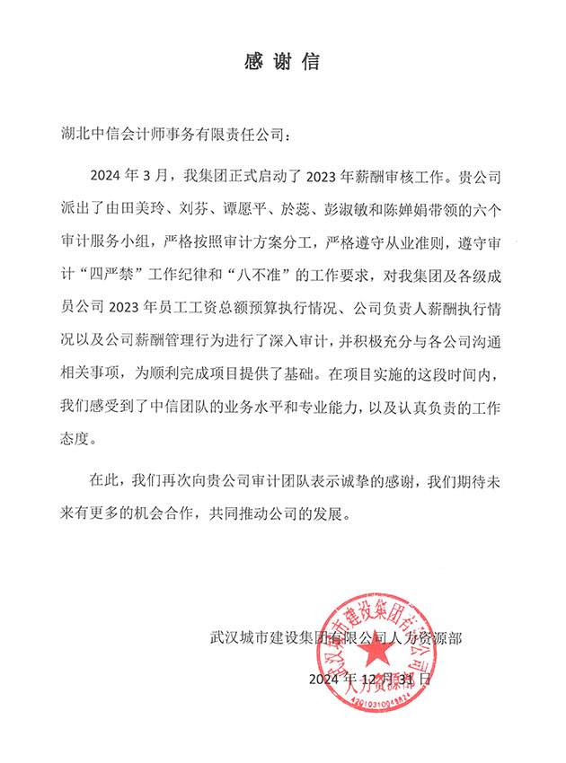 武漢城市建設(shè)集團(tuán)有限公司人力資源部感謝信