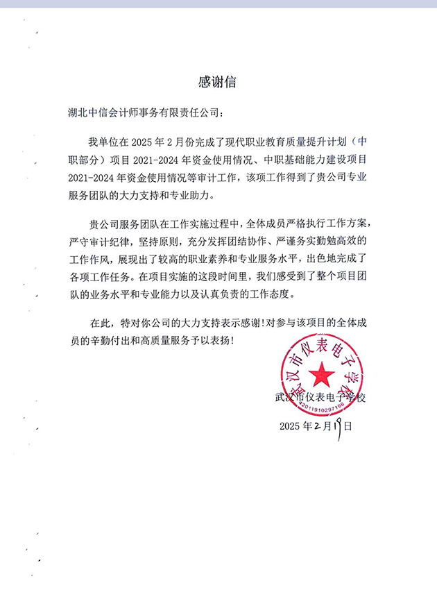 武漢市儀表電子學(xué)校感謝信