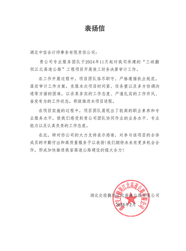 湖北交投翻壩江北高速公路有限公司表揚(yáng)信
