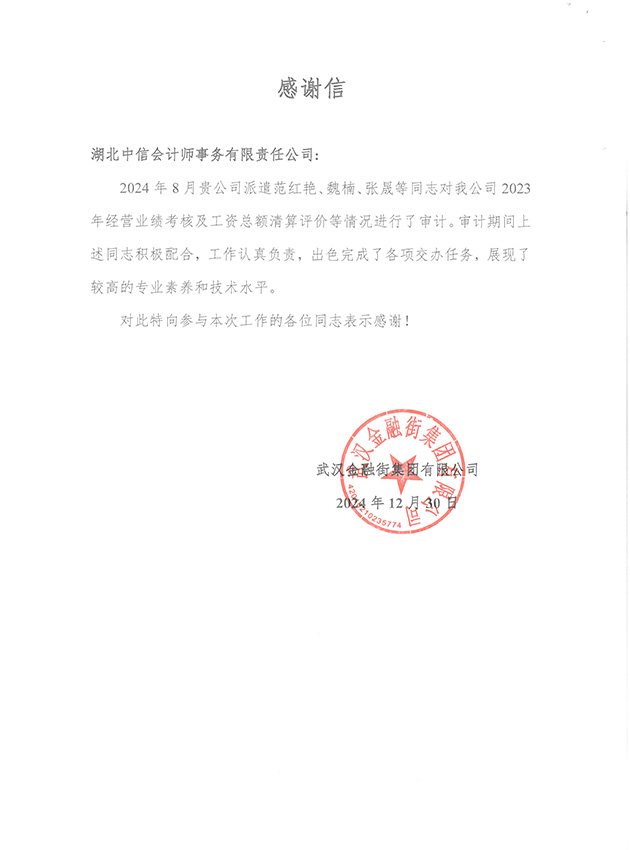 武漢金融街集團(tuán)有限公司感謝信