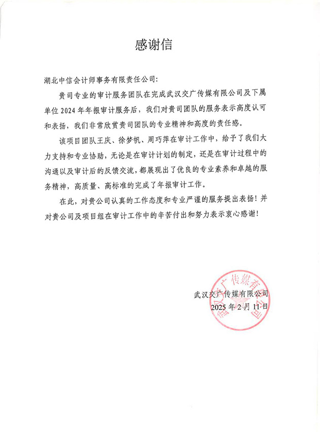 武漢交廣傳媒有限公司感謝信