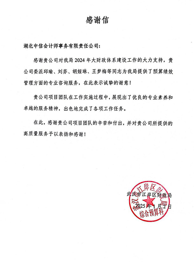 武漢市江岸區(qū)財(cái)政局感謝信