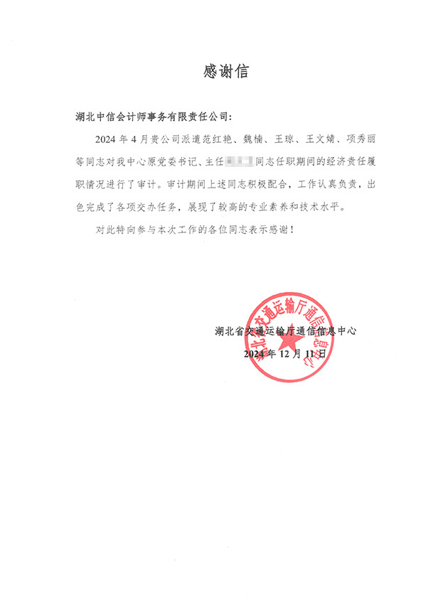 湖北省交通運(yùn)輸廳通信信息中心感謝信