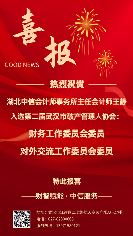 熱烈祝賀 | 主任會計(jì)師王靜入選第二屆武漢市破產(chǎn)管理人協(xié)會委員