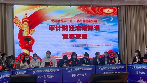 據(jù)悉,本次“審計(jì)財(cái)經(jīng)法規(guī)知識(shí)競(jìng)賽”活動(dòng)是江漢區(qū)審計(jì)局、財(cái)政局、司法局為聯(lián)合推動(dòng)江漢區(qū)審計(jì)財(cái)政法治宣傳工作的創(chuàng)新發(fā)展,強(qiáng)化審計(jì)財(cái)政機(jī)關(guān)、區(qū)屬預(yù)算單位、國(guó)企以及審計(jì)評(píng)估等中介機(jī)構(gòu)依法行政、依法決策、維護(hù)財(cái)經(jīng)法規(guī)的意識(shí),促進(jìn)新修訂實(shí)施的《中華人民共和國(guó)審計(jì)法》(以下簡(jiǎn)稱:新審計(jì)法)和《中華人民共和國(guó)預(yù)算法實(shí)施條例》(以下簡(jiǎn)稱:新預(yù)算法實(shí)施條例)以及《中華人民共和國(guó)會(huì)計(jì)法》、《中華人民共和國(guó)招標(biāo)投標(biāo)法》、《財(cái)政違法行為處罰處分條例》等審計(jì)財(cái)經(jīng)法規(guī)的普法宣傳與貫徹實(shí)施工作,本著“比拼真業(yè)務(wù),彰顯真水平”的原則,引導(dǎo)區(qū)審計(jì)財(cái)政機(jī)關(guān)、預(yù)算單位、社會(huì)中介機(jī)構(gòu)“用好財(cái)經(jīng)法規(guī),護(hù)航江漢發(fā)展”,進(jìn)一步維護(hù)經(jīng)濟(jì)持續(xù)健康發(fā)展和社會(huì)穩(wěn)定大局、促進(jìn)依法行政、推動(dòng)江漢法治政府建設(shè)的重要主題活動(dòng)。當(dāng)天出席活動(dòng)并擔(dān)任決賽評(píng)委嘉賓的有省審計(jì)廳、市審計(jì)局、市財(cái)政局、江漢區(qū)委、江漢區(qū)審計(jì)局、江漢區(qū)財(cái)政局、江漢區(qū)司法局有關(guān)領(lǐng)導(dǎo)。