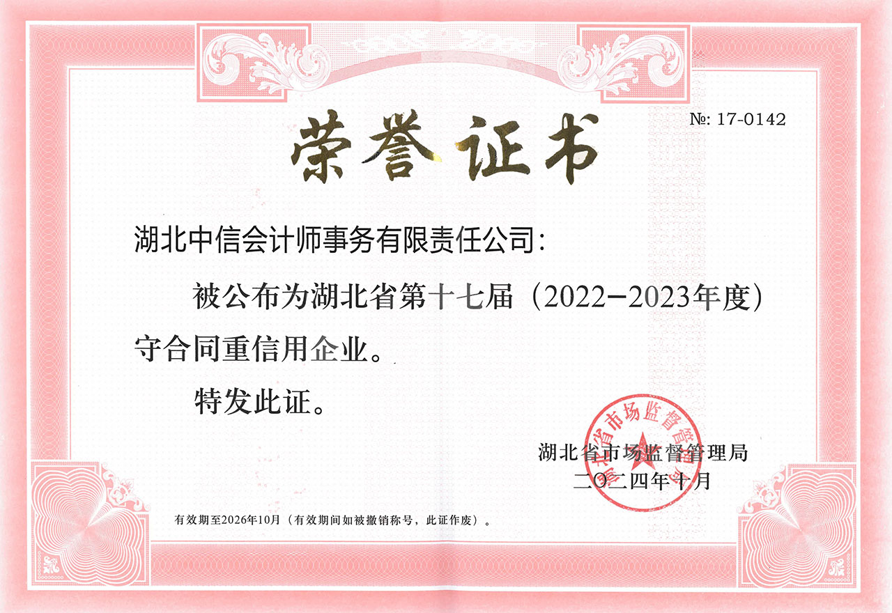 湖北省第十七屆(2022-2023年度)守合同重信用企業(yè)榮譽證書