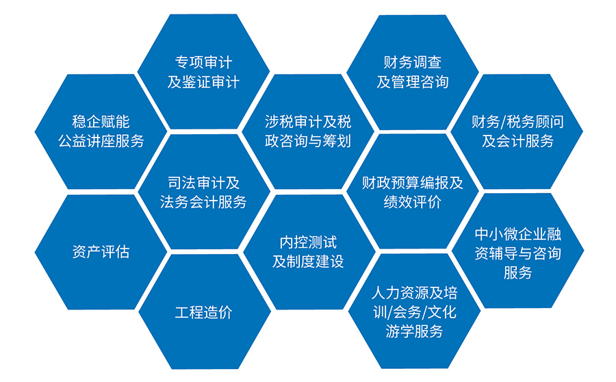 審計、稅務(wù)、績效評價、內(nèi)控管理咨詢、制度設(shè)計、國企深化改政策及路徑設(shè)計、財政專項(xiàng)審計、法務(wù)會計鑒證會計咨詢及代理會計服務(wù)、管理咨詢、企業(yè)內(nèi)訓(xùn)、稅務(wù)審計、造價咨詢、資產(chǎn)評估、稅務(wù)鑒證、工商/會務(wù)、人力資源代理、穩(wěn)企賦能、中小微企業(yè)融資輔導(dǎo)等。